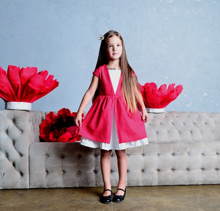 Фантазийное коктейльное платье для девочки. Оригинальное сочетание красного кружевного хлопка с белым фактурным хлопком.