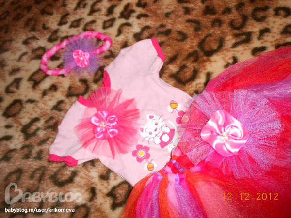 ушло 5 метров фатина, к сожелению не скажу сколько у него была высота)))) ну остались "огрызочки" из них цветочки)))) но я делала длинную юбку, дочке годик она ей в пол, а если короткую то наверное меньше нужно будет))))