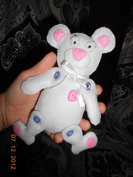 а все из- за того что самое первое что сделала ,это пришила розовые кругляхи на лапки и ушки, потом дошло дело до мордочки , и тут как -то черное уже не вязалось пришлось сделать розовый еще и нос, ну и вышла мордочка девчячья(((, пришлось уж доделывать образ вышила реснички))))