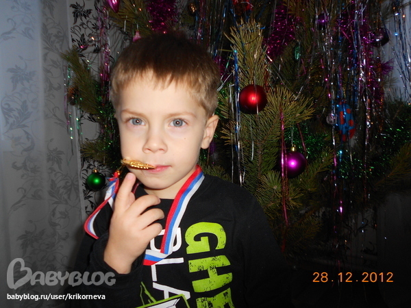 Сашка у нас ходит на борьбу, уже больше пол года. конечно же он еще мал для этого вида спорта ,но в нашем городе по его возрасту и другого предложить не могут , сюда взяли , посмотрели что слушается команды тренера выполняет, вот ходит. перед НГ у них были соревнования "за приз Деда Мороза" . Сашкиной весовой категории три мальчика, те конечно немного постарше, один бороться отказался и вот Сашка и мальчик Миша " боролись" ну если это можно так назвать))))) ну да ладно, главное дали медаль -самую настоящюю , грамоту за первое место, и подарок сладкий! Сашка безумно рад!! с медальюходил 2 дня даже спал с ней , сейчас на елке висит!!