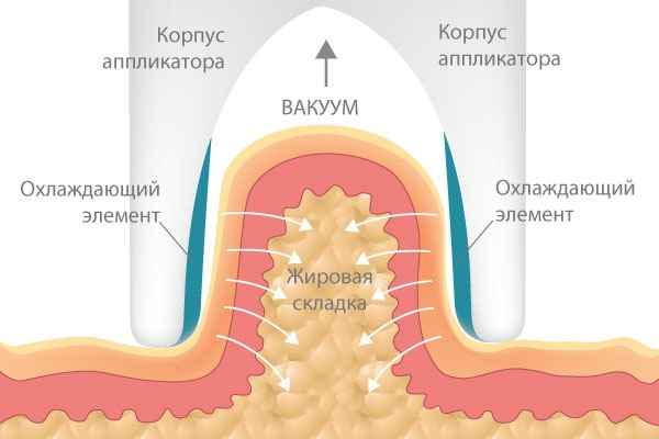 Аппарат для криолиполиза работает следующим образом: специальная вакуумная насадка втягивает жировую складку и охлаждает подкожную жировую клетчатку, отчего начинается естественный процесс гибели жировых клеток, за чем следует активное похудение.