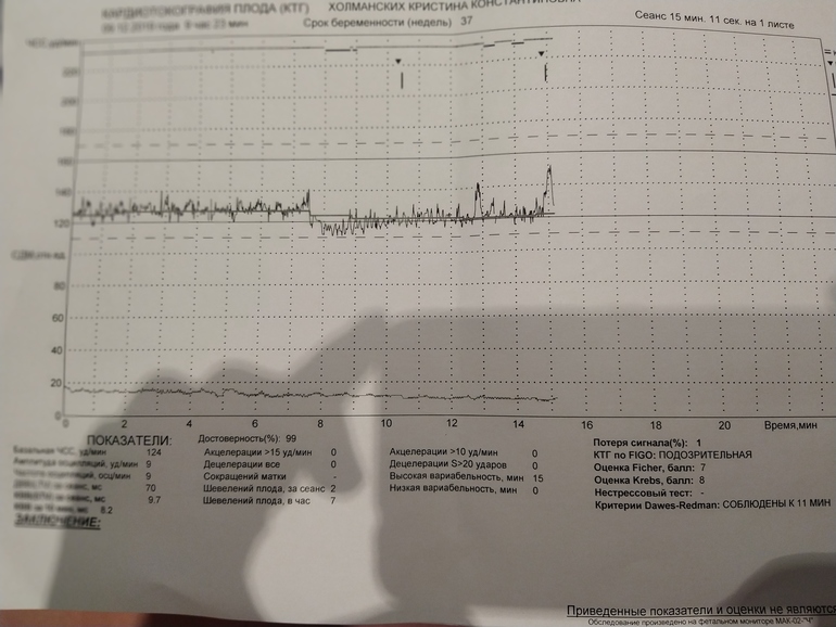 А что вас смущает? КТГ нормальное, 2 нормальных пинка в течение КТГ (хотя я вижу там 3 пинка). Сердцебиение в норме.