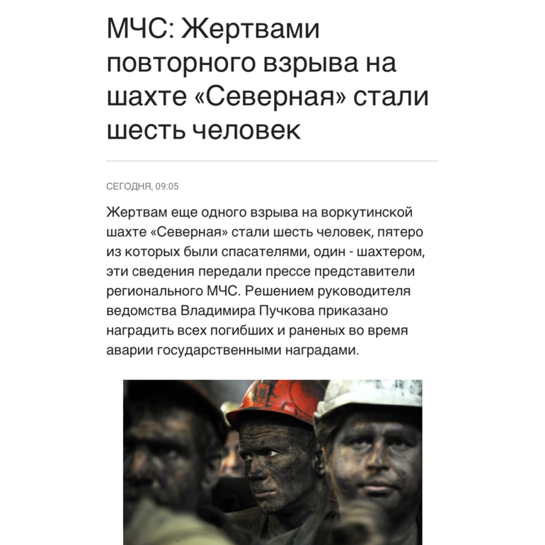 Сколько ещё человек должны погибнуть в Воркуте, чтобы наша страна повернулась лицом на Крайний Север??? Уже 36 жизней унесла "Северная", взрывы на Шахте продолжаются, концентрация метана увеличивается, а информация об этой самой жуткой трагедии на шахтах в истории Республики КОМИ по главному каналу страны - Первому - прошла в вечерних новостях под названием "инцидент" и даже не сюжетом, сука, не сюжетом, а БЗ на 30 секунд!!! Республика в трёхдневном трауре, Воркуту раздирает от боли... А у нас, сука, по центральному каналу в вечерних новостях обсуждают Сирию... Слов нет... Земляки, душой и сердцем с Вами... Это страшнейшая трагедия, которая просто обязана изменить правила угледобывающих предприятий... Правила, написанные кровью... Держитесь...
