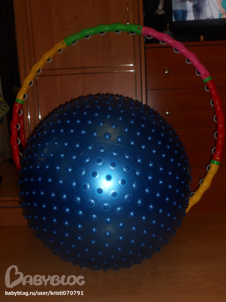 Мяч для фитбола, с дитем заниматься и себе обруч с массажными роликами. Правда колючие такие, но думаю эффект 100% будет, а то у меня есть обычный, металлический, но как то неочень)))) И все кстати очень дешево)))
