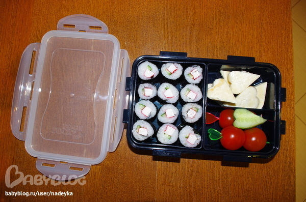 Пятничное Бенто: роллы из крабовых палочек(ох как боюсь я порченной рыбы :(( ) и огурцов, сердечки-сырники, помидоры и огурчик.