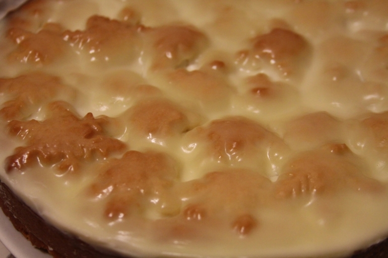 Горячий пирог заливаем кремом сразу прямо в форме!