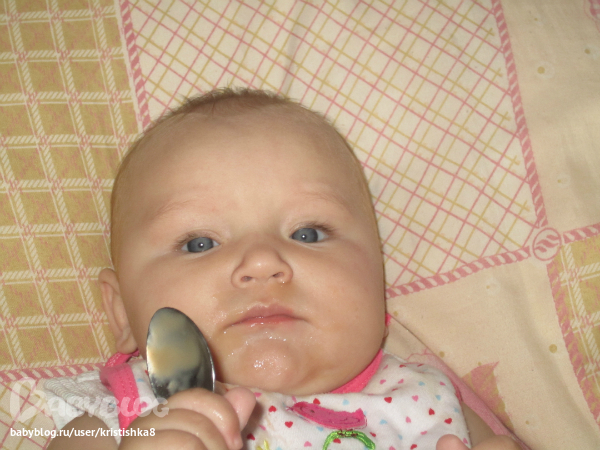 Сегодня были на приеме у педиатара,наш вес - 8300 =) за месяц мы набрали 800гр. ))) а так все у нас хорошо.сегодня пробовали пюрешку банан с яблоком,вроде понравилась)))очень любим соки особенно персиковый)юоже мой как я счастлива))))))))очень люблю свою принцессу