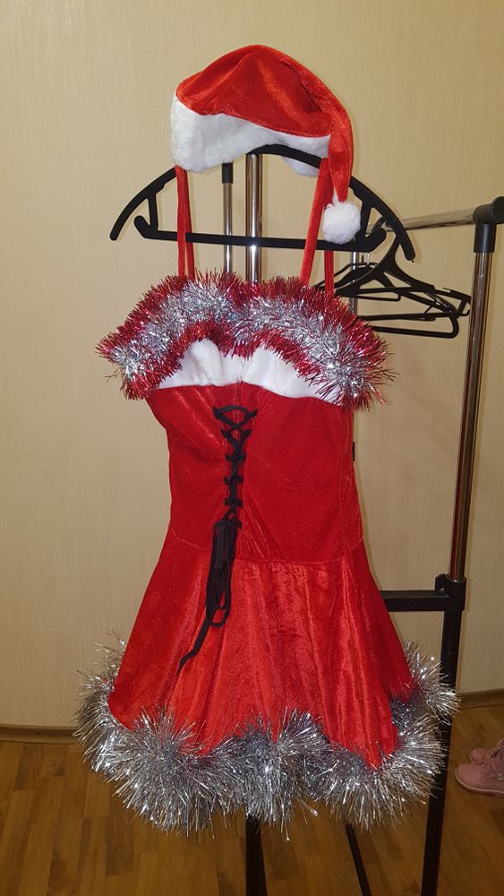 Женский новогодний костюм. В комплекте чепчик и нарукавники, подойдет и на размер 44/М, так как утягивается шнуровкой. Отправляю почтой.