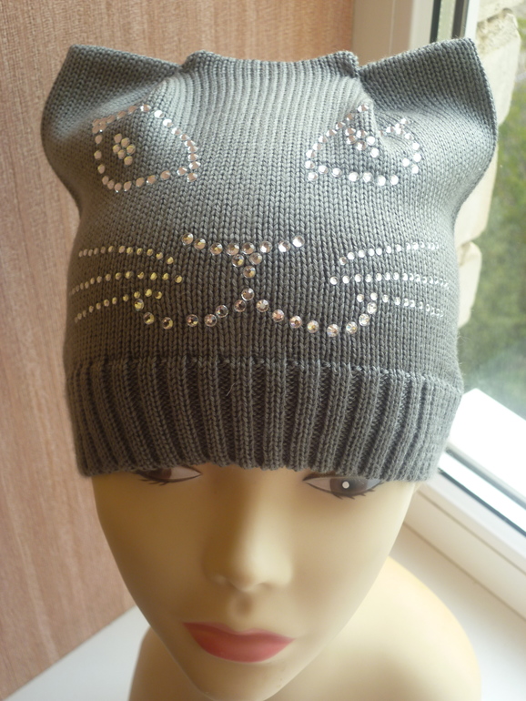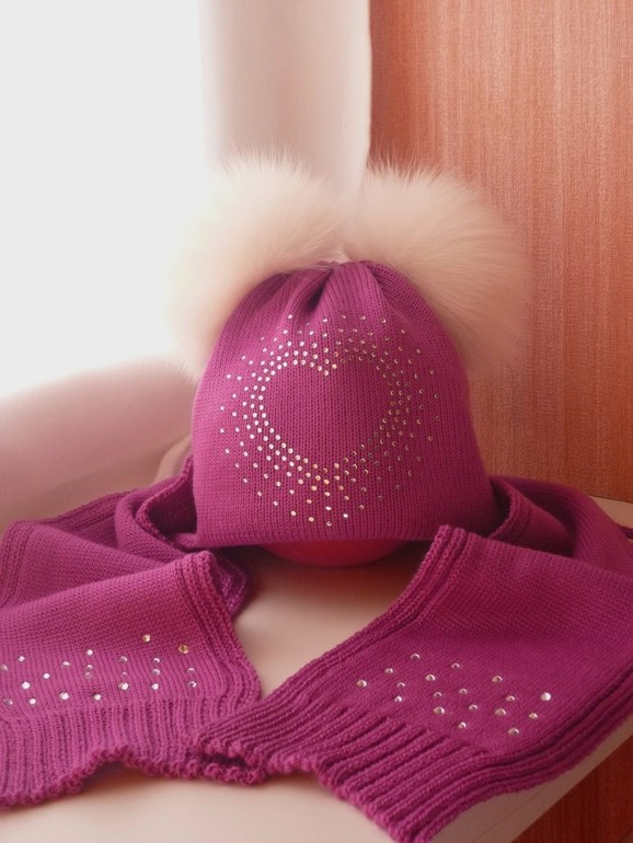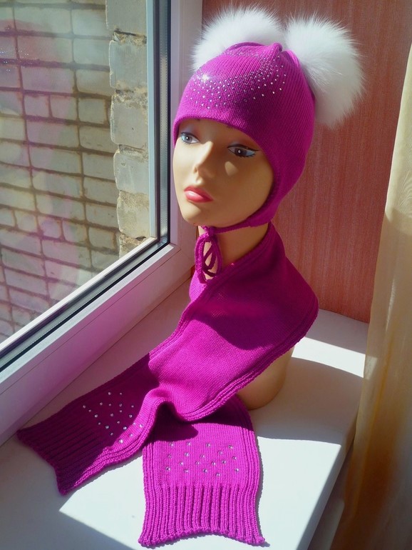 И комплект шапочка двойная и шарфик, стразы переливаются, помпоны песец.
