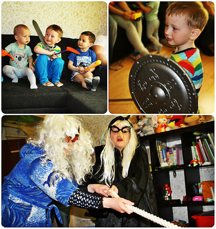 Такой большой уже сыночек!!Отмечали в стиле трех богатырей! Приходили к нам Баба-Яга и Кикимора проверять силушку богатырскую)) (В костюмах наши друзья) сценарий писала я (конечно с помощью интернета) Деткам было очень весело, да и мы посмеялись от души) На фото с лучшим другом Тимой (дружат с РД) Тортик с Алешей Поповичем, которому в последствии откусил голову!! Подарили много подарков, больше всего понравилось Руслану кресло-мешок) За который был бой)