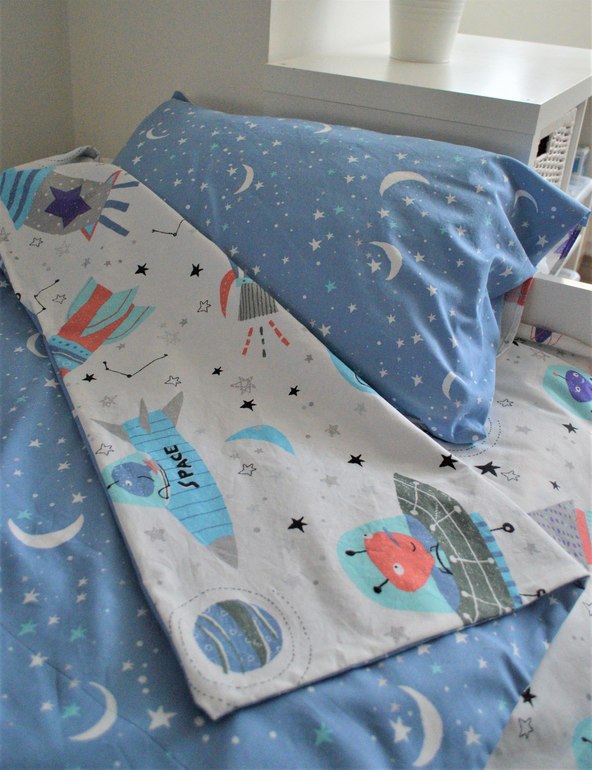 В набор входит:- подушка 50*70 - пододеяльник 104*140 - простынь на резинке - боритики на три стороны - флажки 2.10 Ткань 100% хлопок Не просвечивает Плотный , на ощупь мягкий, приятный