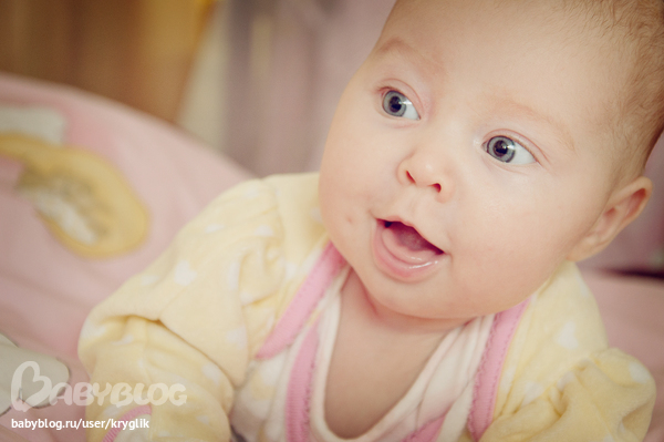 Вчера наша Бусинка первый раз засмеялась в голос, да так громко и долго))))) Мы даже успли это всё на фотик снять. Раньше она только улыбалась и издавала крики восторга, ну или могла лежать широко улыбаться, как бы смеясь но молча. А вчера пришёл наш папа с работы и начал строить ей глазки, а она ка расхохочется, да такой смех прикольный и хохотала долго минут пять наверно))))) Какая же она сладенькая