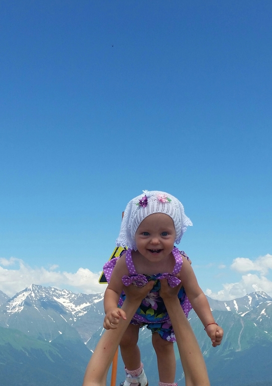 Но один день все таки посвятили небольшой экскурсии. Ездили на Розу Хутор. Поднялись на высоту 2300 м.Пелагея подьем перенесла нормально,в кабинке фуникулера смотрела вниз☺