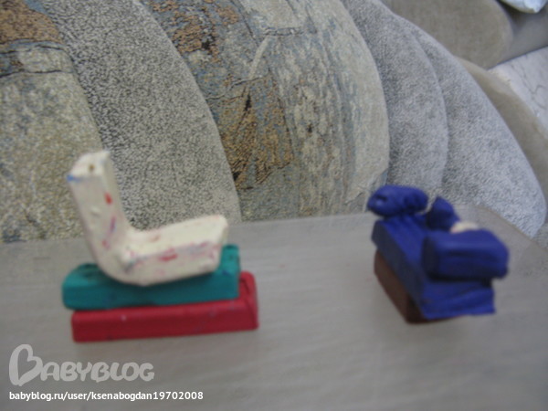 Опять мы дома- не прошло и недельки после двухнедельной болезни((((( ничего не хотим делать, хотим только в сад, а вот с пластелином немного сладили...слеплено на заказ (мой)))) диван и телевизор на комоде...лепил сам