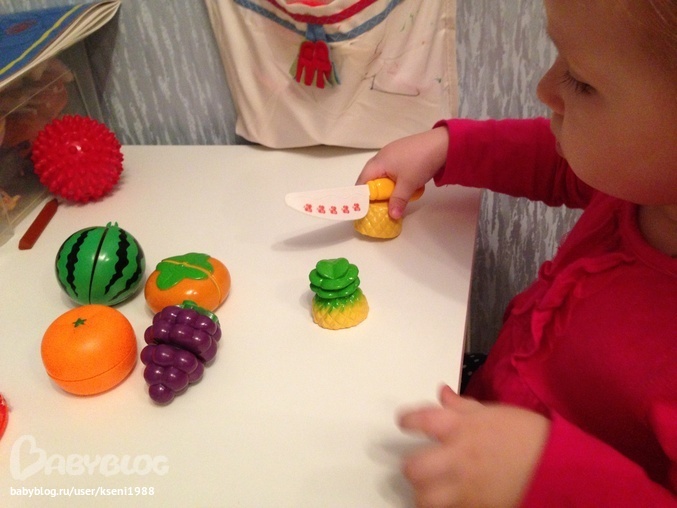 Резалку мы тоже любим)) Ставлю две тарелочки. В тарелочку кладу целые фрукты. Она берет из тарелочки,режет, половинки складывает в другую, потом кормим этим "салатом" куклу. Затем опять половинки фруктов соединяем, т.е находим пару.