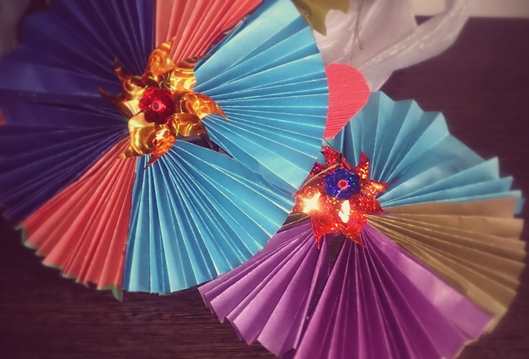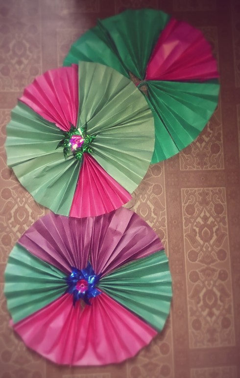 2. Самодельные веера , украшения на стенку, делается очень легко, из обычной цветной бумаги, сложенная в гармошку и скрепленная степлером