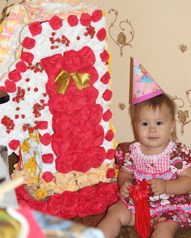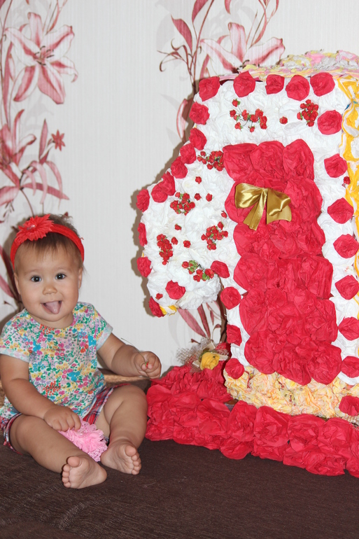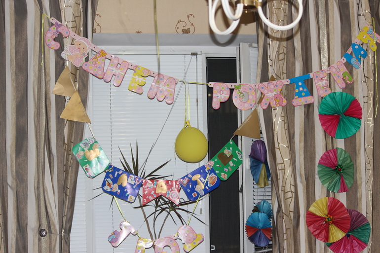 Розовую растяжку, делала из старой растяжки "C Новорожденным", когда то эта растяжка у нас висела ровно год назад так же на окнах и теперь она нам опять пригодилась) Только я ее переделала на "С Днем Рождения " и "1 год", добавив несколько само наделанных букв))
