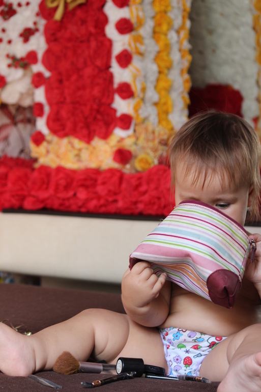 Ну и еще фотки, где она ковыряется в моей косметичке, в которой она кстати может лазить часами, доставая от туда карадаши, тюбики и прочее