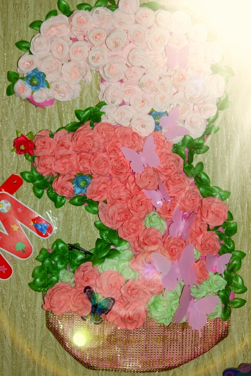 бумажная гирлянда из цветов на стене, воздушные фольгированные и гелевые светодиоидные шары, помпоны, на окне растяжка из фетра " С днем рождения Злата" которые я шила в прошлом году)) ну и по традиции наша "троечка" на стене)