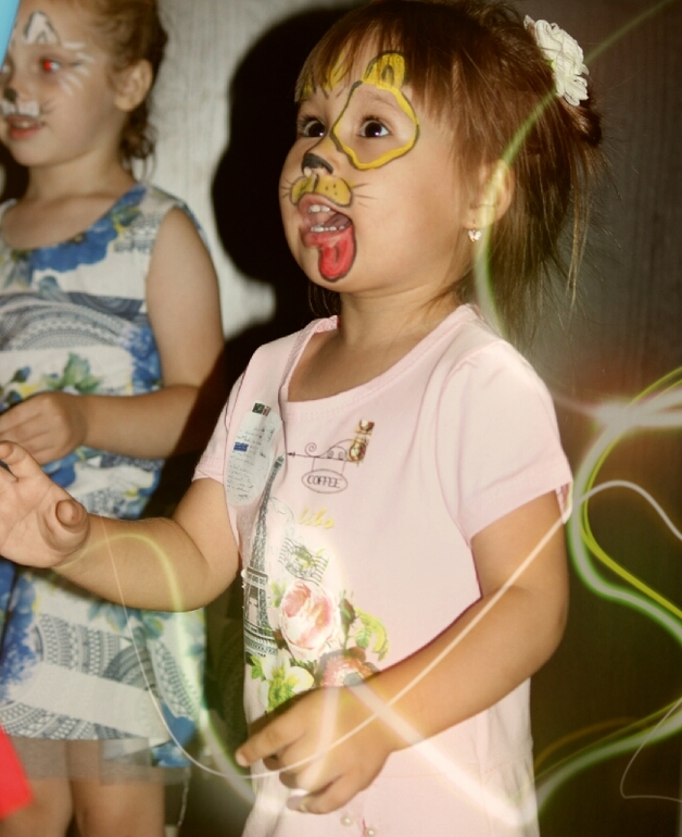 , у нее были крутые реквизиты для конкурсов с детишками, мыльные пузырики, аквагрим,
