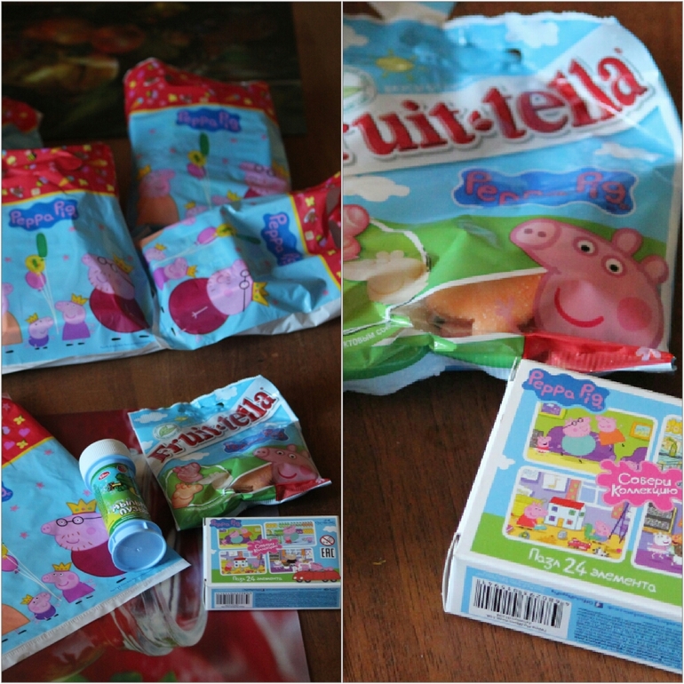И подарочки в милых пакетиках: пазл, мармелад, все по мотивам героев мультфильма и всеми любимые мыльные пузыри))