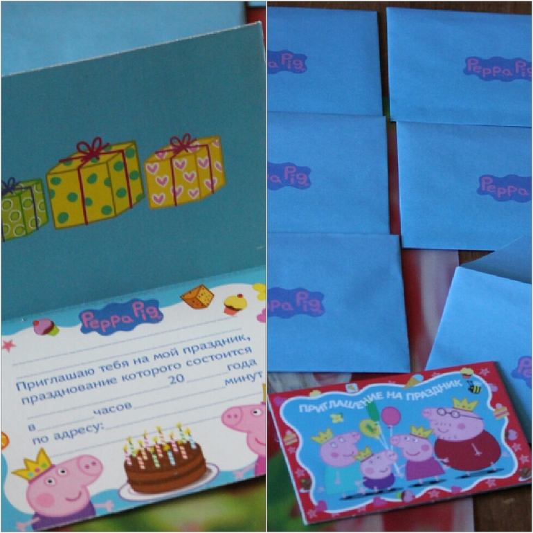 Подготовку к празднику я начинала задолго к торжеству, сначало выбирала тематику к празднику и по душе пришлось организовать праздник по этому мультику, во первых это один из любимых мультфильмов дочки, ну и во вторых очень распространены аксессуары к празднику на эту тему, так что долго что либо искать не пришлось, что то купила на Aliexpress, к примеру шарики, помпоны и тд, но к сожалению не все заказанное мною пришло ((на Ozon приобрела набор для чаепития "свинка Пеппа" (тарелки, кружки, дудки, колпачки, растяжка). Так же там были заказаны нашим маленьким гостям вот такие пригласительные, яркие, большие в индивидуальном конвертике))