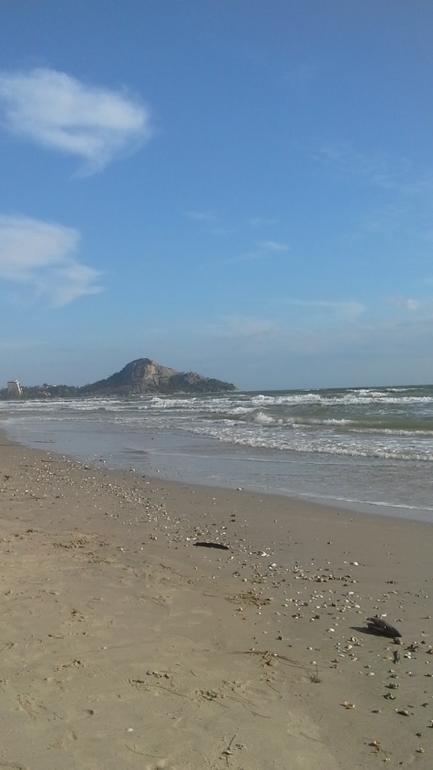 Пляж Khao Takiab. Пляж закрывает гора, возможно из-за этого тут почти никогда не было волн, но все же были. Песочек здесь темно-серый, при намокании получается как черный песочек. Забегая вперед скажу, что когда мы переехали во второй отель, мы переехали именно на этот пляж.