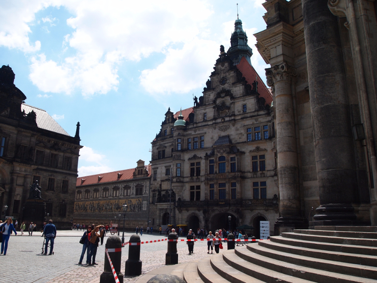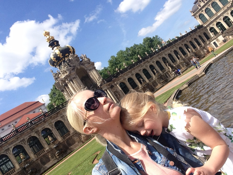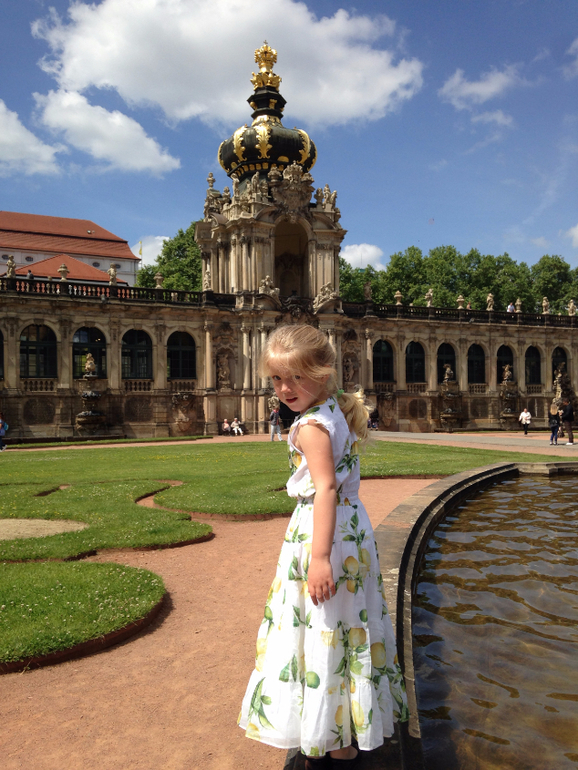 17 июня - поездка в Дрезден. Именно эту поездку я запомню надолго. Так Саша отметила свои 4.5 года... Я купила селфи палку, когда мы еще только летели, и Саша с ней так заигралась, что врезалась в столб, да не простой столб, а расписной с узорами, века так 18-го, с вензелями. Она шла чуть позади меня и вдруг бац,крик, поворачиваюсь, Саша кричит, по лбу льется кровь...Я бегом ее усаживаю, сама падаю на брущатку и начинаю закрывать рану. Хорошо это было на центральной площади, около кафе на открытом воздухе, прибежала оициантка, дала стул,лед, воду, подошли немцы предложили пластырь, спросили не надо ли врача...Так мы посидели 10 минут, встали и пошли. В целом сейчас уже от раны не осталось и следа...Но запомнилось навсегда.