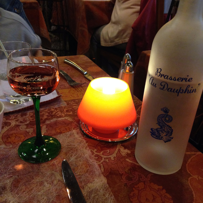 Ужин у нас был запланирован в ресторане Au Dauphin, что на кафедральной площади. Нашли достаточно быстро, и как хорошо, что погода была ненастная, так как в этот ресторан можно попасть только по резерву столика. Все очень вкусно, розе было божественное. Отлично посидели и показалось недорого.