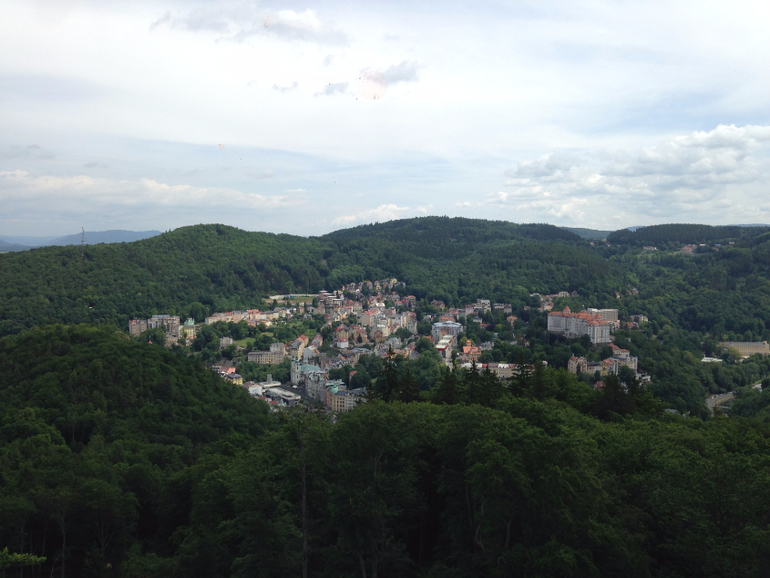 На утро погода совсем наладилась, после посещения бассейна мы решили забраться на Диану, довольно высокая гора в Карловых Варах, но с учетом того, что после вчерашнего дождя было прохладно в лесу, мы забрались достаточно быстро. Виды с высоты птичьего полета очень красивые, обратно мы хотели спуститься на фуникулёре, но у мамы не было монет крон, а евро они не принимают, слёз было море, но ничего спустились пешком=)