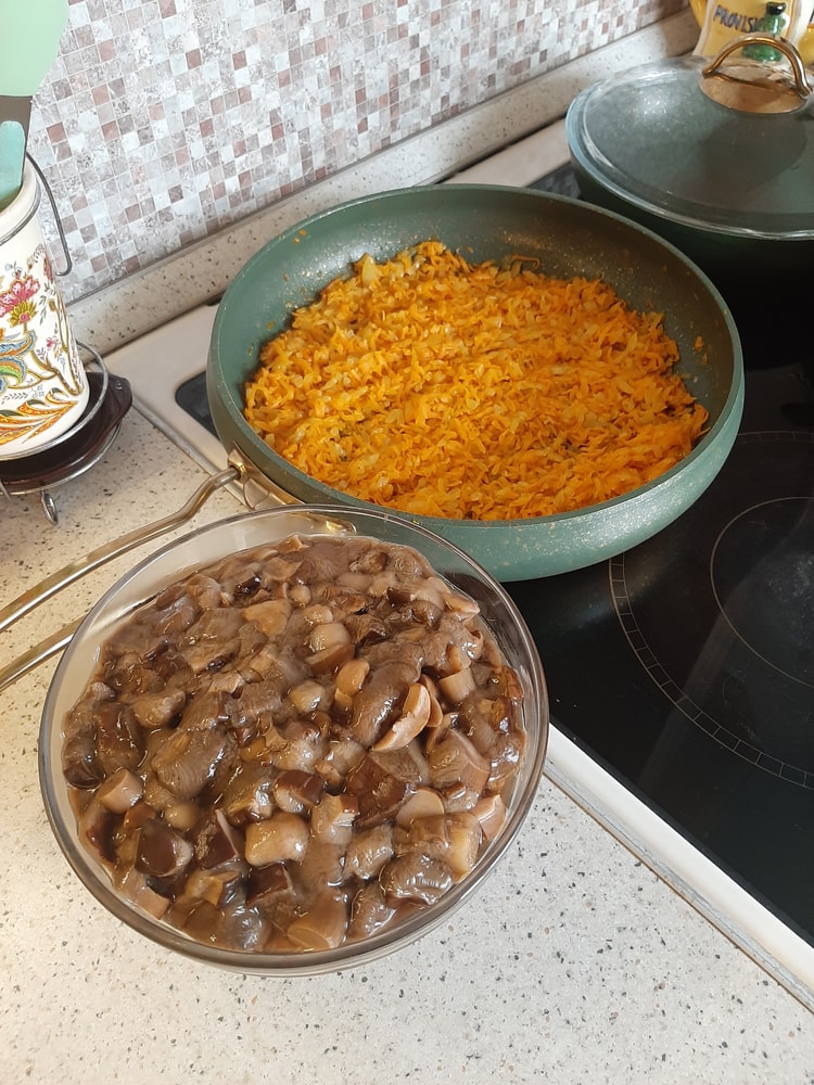 Растительное масло - 30мл(для обжарки лука с морковью), 100мл(для тушения икры)