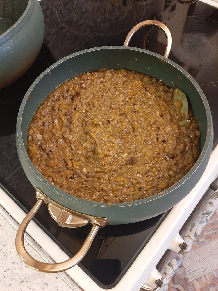 В мясорубке перекручиваем грибы и зажарку через крупную решетку. В казане(или кастрюльке) тушим полученную массу с добавлением соли,соевого соуса,лаврового листа, масла, сахара и перца в течении 40 минут, на среднем огне.