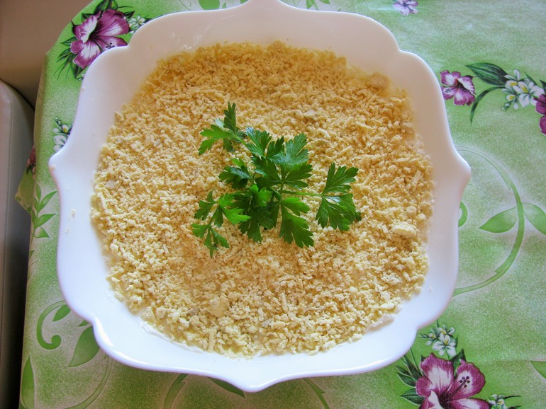 Натереть на мелкой терке желтки и посыпать сверху салат.