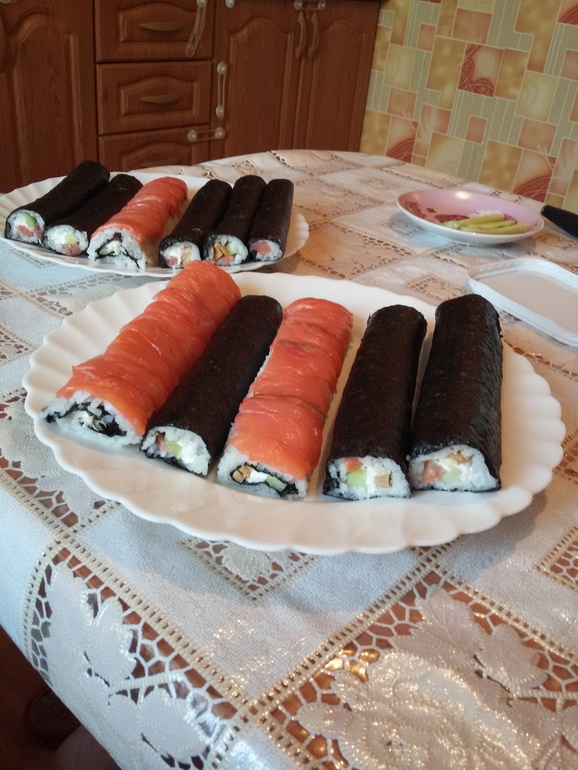 Некоторые роллы делала вывернутыми и клала пластинки семги сверху.