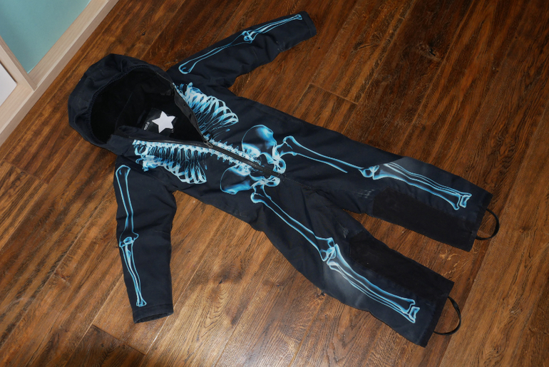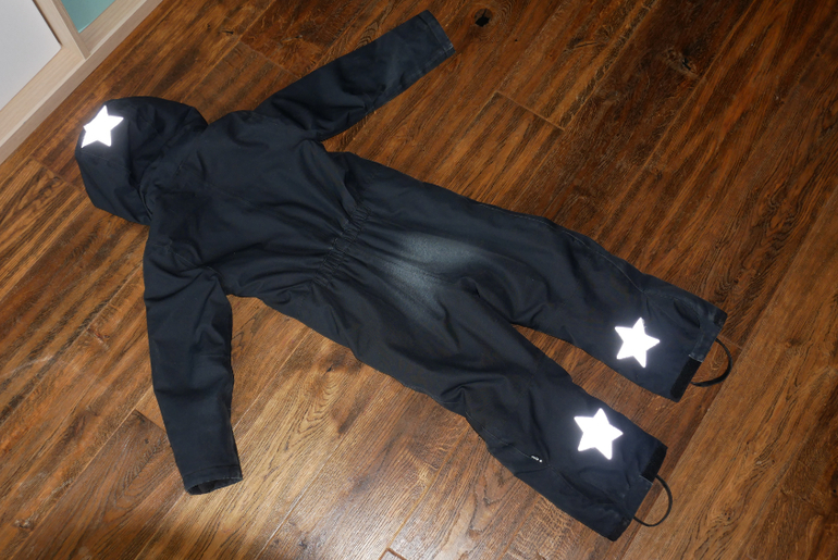 Из плюсов: легкий, прочный, не сковывает движения, теплый (Tinsulate),прочные силиконовые штрипки и липучки для утяжки по обуви, капюшон на липучках (снимается легко), молния плавная и ребенок сам легко одевает-снимает его.