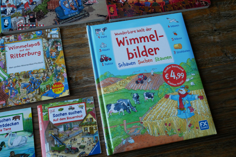 9. Wunderbare Welt der Wimmelbilder. Виммельбух с мелованными страницами в пухлой обложке. Книга очень удобного формата 215 x 277 мм, 48 страниц: в хлеву, на молочной ферме, в джунглях, в зоопарке, в море, в рыбном порту, в Арктике, на птичьем дворе, в саду, автомобильная дорога, на лошадиной ферме, на берегу моря, в парке, в лесу, в пруду, на овечьей ферме, в ресторане, в теплице, в горах, во время сбора урожая. По краям страницы предложены задания. Придется напрячь внимание, ведь если найти два красных ведра не составит трудности, то найти 10 ракушек не так то и легко, а ведь их еще нужно сосчитать. Цена 800р.