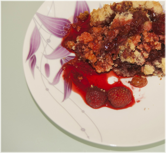 Кушать теплым, полить готовый крамбль сиропом из клубники.