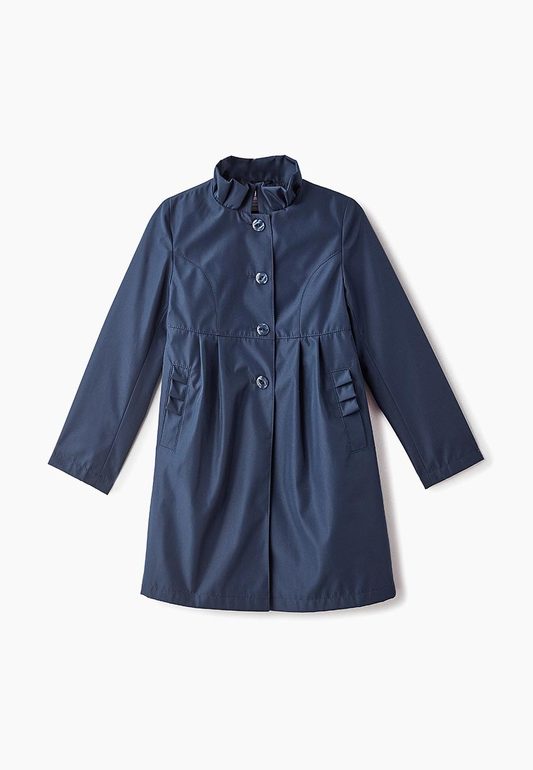Плащ из плотной плащевой ткани с водоотталкивающей пропиткой. Детали: Завышенная талия, застёжка на пуговицах, воротник стойка в виде рюши, два боковых кармана, подкладка.