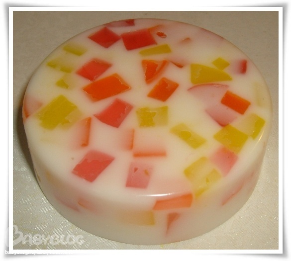 Сбрызгиваем спиртом и заливаем немного белой основы. Не дожидаясь, когда все окончательно остынет, добавляем еще цветных кусочков основы и снова заливаем белой основой. Не забываем каждый новый слой пшикать спиртом – чтобы не было пузырьков в готовом мыле и чтобы слои лучше сцеплялиьсь.