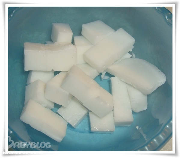 Режем белую основу на кусочки добавляем 1/3ч.л. масла ши (карите)