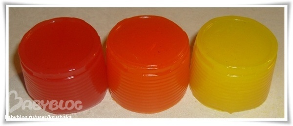 Плавим в микроволновке или на водяной бане, добавляем 1/3ч.л. меда, пару капель желтого пигмента и 5 капель отдушки мед. Хорошо перемешиваем и оставляем остыть. Так же поступаем еще 2 раза, окрашивая основу в оранжевый и красный цвет.