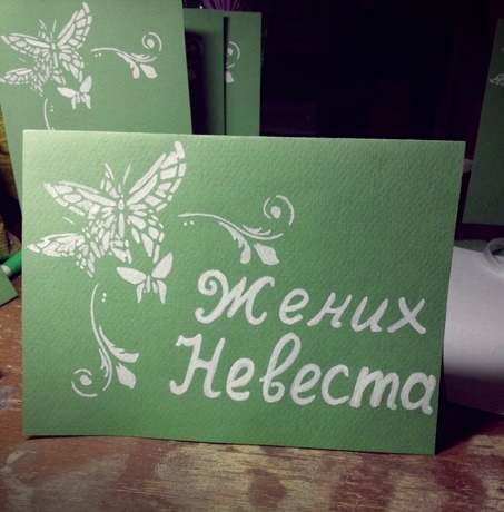 Трафаретка вторая по счёту, первая была бумажная, склеилась с картонкой и порвалась... В итоге мучительно вырезала вторую и таки смогла оформить рисунок на всех семи карточках =))) Кое-где косячно, но всё равно будет круто смотреться)