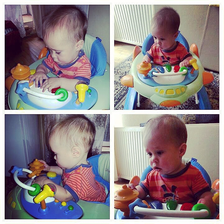 Недели две назад купила ему ходунки. Ненадолго сажаю каждый день, минут по 20-30 там сидит, если это можно так назвать)))) Принцип он еще не понял, потому по квартире в них не летает, а стоит на одном месте, опираясь грудной клеткой на переднюю панель))))