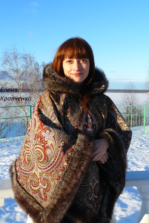 Очередной заказ окончен.Девушка Валентина(она на фото) в полном восторге.Я уж и говорить не нужно.Пока шли её фотографировать Все оборачивались.Если кто захочет .обращайтесь.Ушло 2 платка,но ещё будет сумка на фермуаре и варежки.Далее фото