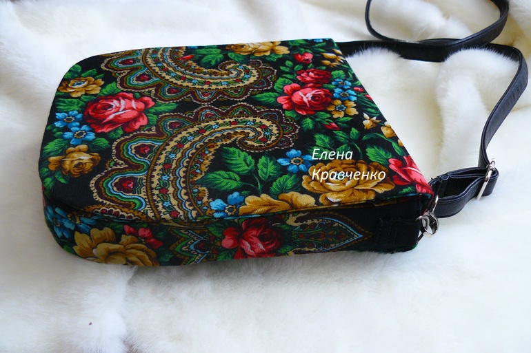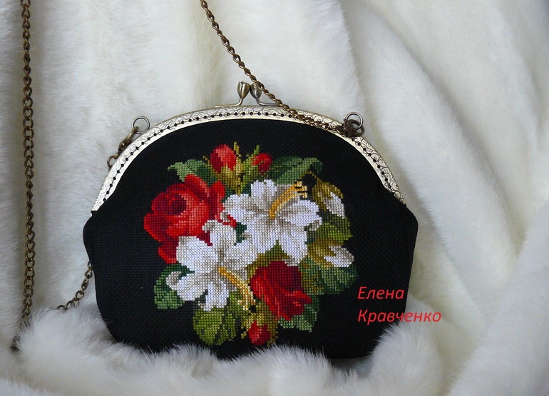 Получилась вот такая сумочка.Канва № 16 чёрная.Нитки хлопок ДМС. 30 цветов.Размер 22 на 17.По боку ширина 6 см