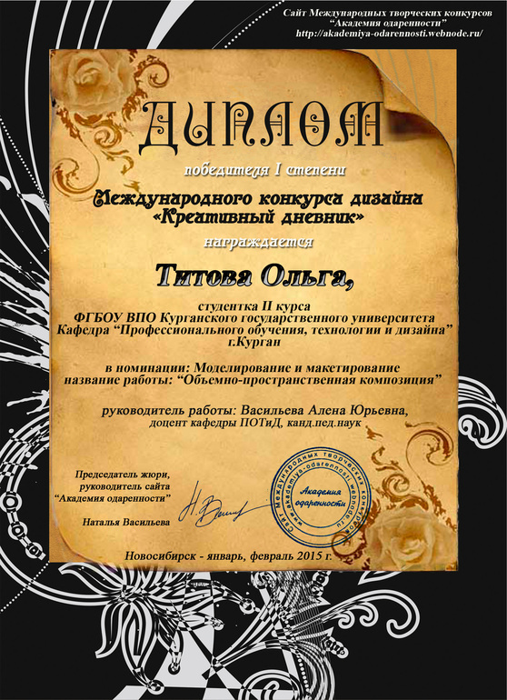Даже не ожидала получить такое признание и заслужить первое место за свои работы по формообразованию. После просмотра преподаватель предложила по участвовать в конкурсе на лучшую работу в Академии одаренности в городе Новосибирске. Мне это ничего не стоило (без особого энтузиазма) решила попробовать. Участвовали все, и через неделю приходит ответ и диплом победителя 1 степени. Была в шоке ничего не сказать, к своим работам (как и к себе) отношусь критично, и не вижу особо в них какой то не ординарности (явно один из первых критерий отбора).... Но тем не менее комиссии из 15 человек (из разных отраслей) понравилось. Значит я в правильном направлении работаю и двигаюсь в целом. Так что девочки побед вам, главное сильно за хотеть и любить своё дело которым занимаетесь. Удачи вам девочки.