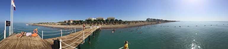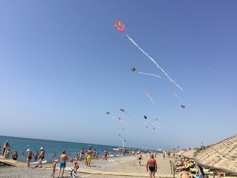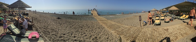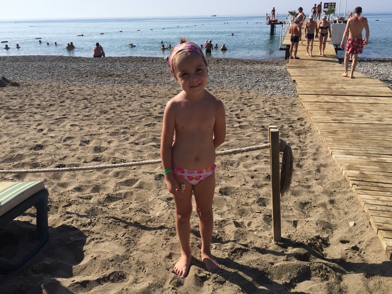 Отдыхали мы с 9 по 17 сентября. Погода была отличная, безоблачная 36-39гр, вода теплющая, вылезать из нее не хотелось, что собственно мы и делали первые 2 дня, не могли накупаться, учитывая наше холодное лето в этом году((( Море по утрам- чистое и спокойное, а вот после обеда были небольшие волны и вода была немного мутновата. Пляж большой песчано-галечный, лежаков много и в основном все под навесом , всегда можно было найти свободное место в любое время.