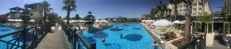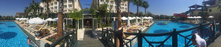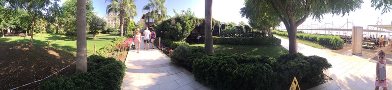 Территория очень чистая и зеленая. Для курения отведено специальное место, что порадовало. Очень понравился бассейн, большой и чистый, глубина 1,4м, а для совсем маленьких был небольшой басейнчик-лужа с грибом и дельфинчиком. Вообще, это первый отель, где я видела столько много детей дошколят и мамочек с грудничками.