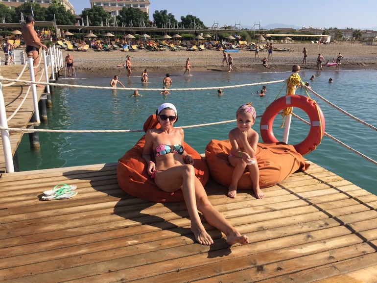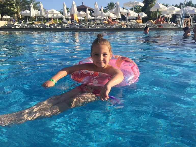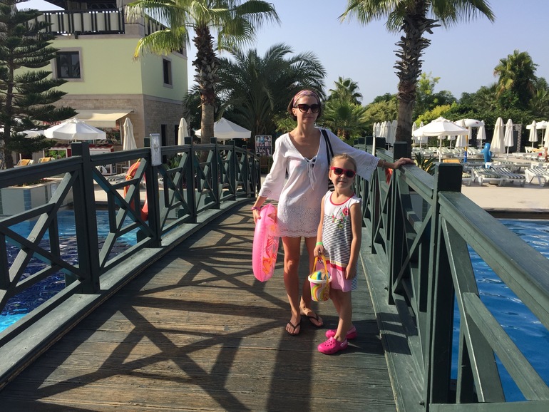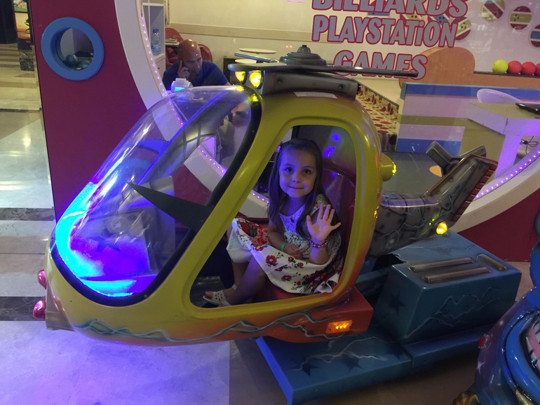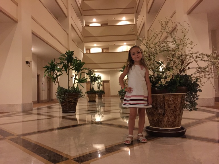 Отель представляет собой два соединенных пятиэтажных корпуса с небольшой территорией (мне такие отели больше нравятся, все в шаговой доступности и очень удобно с маленькими детьми), но несмотря на это на территории все есть: бассейн, магазины, спа-центр, тренажерный зал, крытый бассейн, детский мини клуб, рестораны, уличные тренажеры, кальян, парикмахерская, игровая комната, куда мы часто ходили играть в бильярд, а Виталина в автоматы.