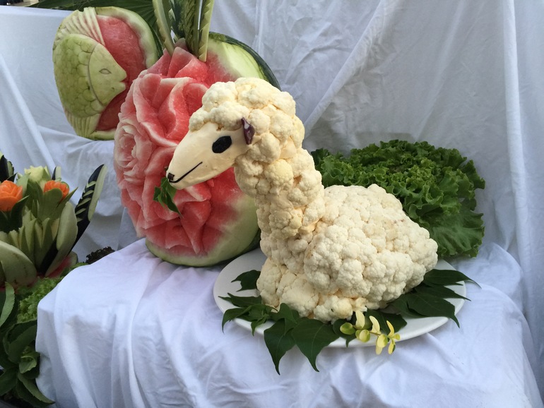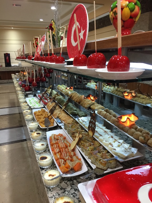 и овощей, выпечки и сладостей, из мяса- курица, ягненок, баранина, индейка, а вот морепродуктов практически не было, кроме одной рыбы в разном исполнении, которая мне совсем не понравилась , еще в последний день были жареные стейки из семги вроде; по утрам была каша, в обед 2 вида супа, также там есть отдельный диетический стол. Очень много было особых и красивых блюд в тематические вечера.